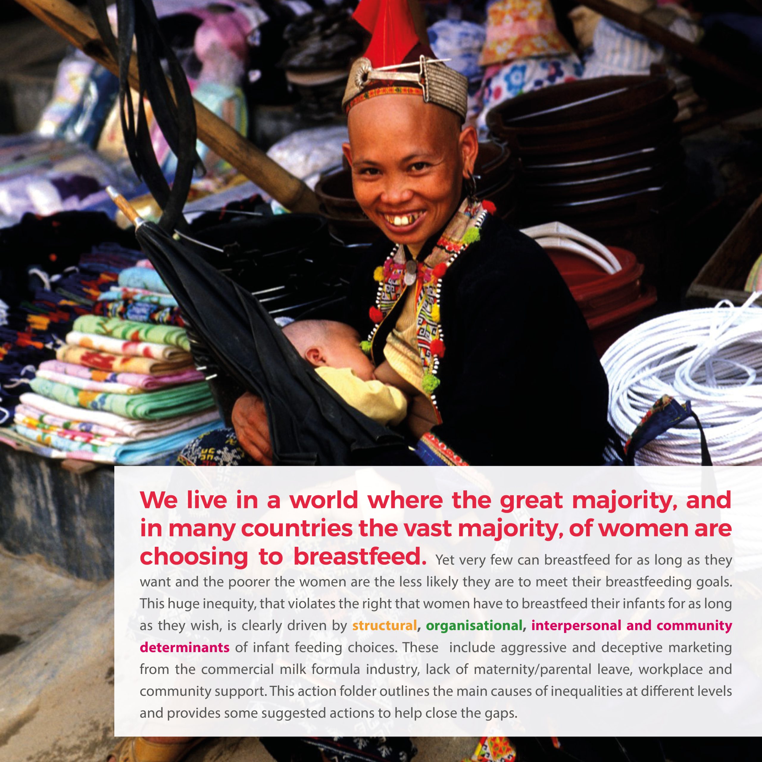 Differences in breastfeeding rates do not only occur between regions and countries but also within countries. The inequity in breastfeeding is driven by structural, organisational, interpersonal and community determinants of infant feeding choices. Read the action folder for more information.
